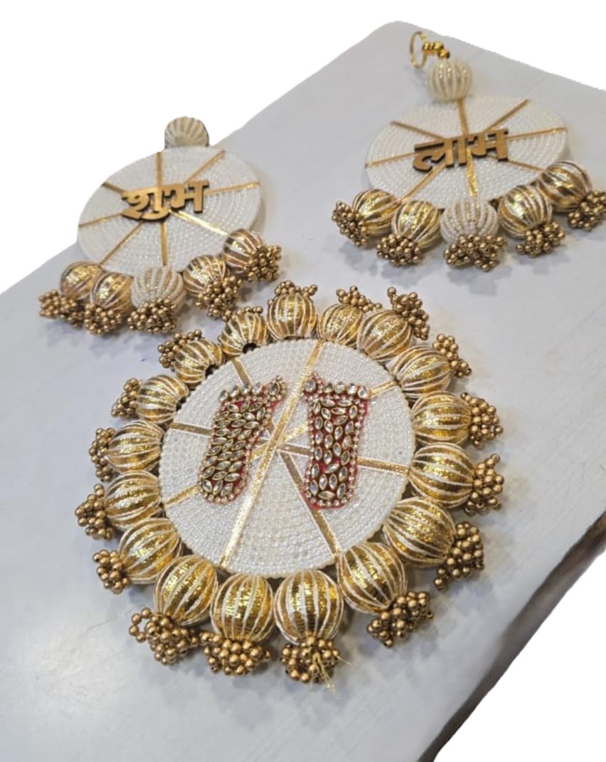 Complete your pooja setup with this Golden Beads Shubh Laabh and Charan bundle — symbolic, spiritual, and festive.