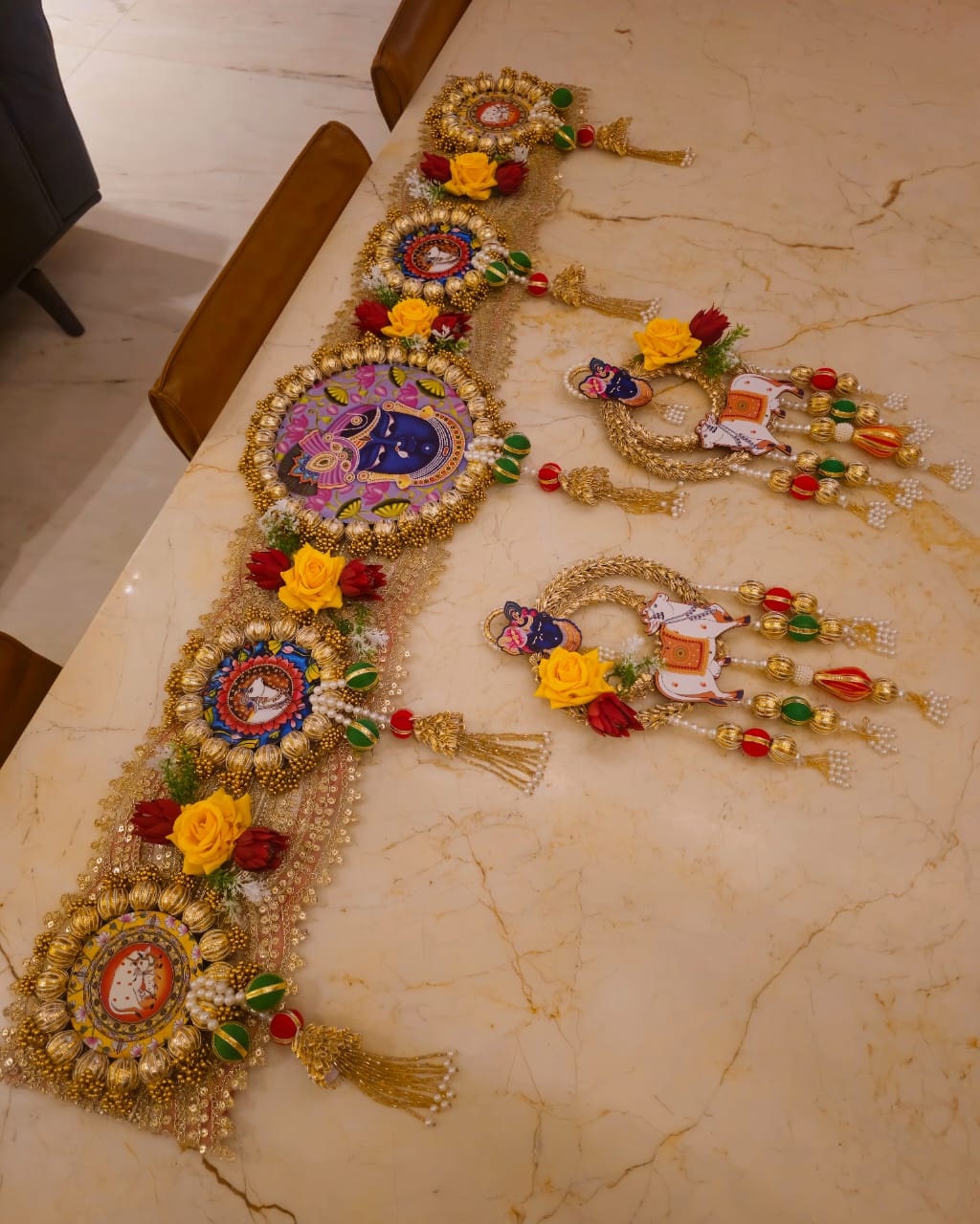 Add divine charm to your home with this Golden Floral Pichwai Bandarwal featuring Shrinath Ji artwork.
