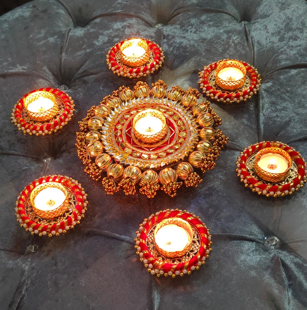 Embrace the festive warmth with this Golden Rangoli set featuring T-Lights – perfect for Diwali and pooja décor.