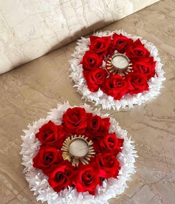 SKU:TLT-RW-FLR-2PC-002 Category:Festive Décor Tag:#FloralTLight #RedAndWhiteDecor #WeddingLighting #FlowerTLight #TraditionalTLight #ColorfulDecor