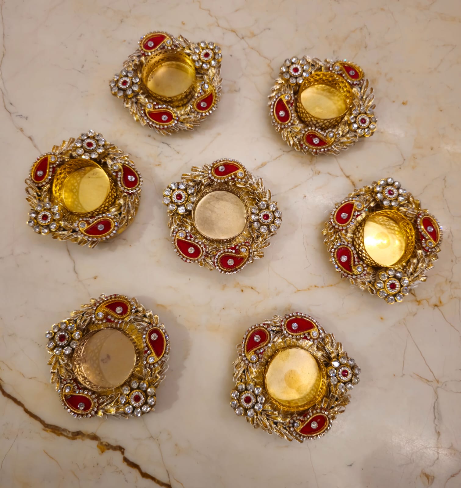 Traditional charm meets shimmer in this 7-piece Golden Gota Ring T-Light set – ideal for Diwali lighting.
